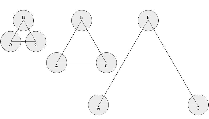 例えば、正三角形を知覚する際に、細胞集成体A、B、Cは内角60度の頂点の知覚に反応して活性化します(上図)。これらの細胞集成体の間で位相連鎖が起こると、直線(辺)の知覚が生じ、正三角形としての知覚が確立されます。三角形の内角の角度が同じ60度であれば、三角形の大きさが変わっても、同じ細胞集成体が活動し、これにより、通常、人はこれら大きさの異なる正三角形を「類似の三角形」として知覚します。つまり、細胞集成体は三角形の頂点という知覚要素に反応して活動しますが、細胞集成体間の柔軟な位相連鎖が要素間の接続を担っているため、辺の長さが変化しても図の3つの三角形を類似のものとして知覚する「知覚学習の般化」が起こるのです。ヘッブは、「知覚学習の般化」の機序をこのように考えました。