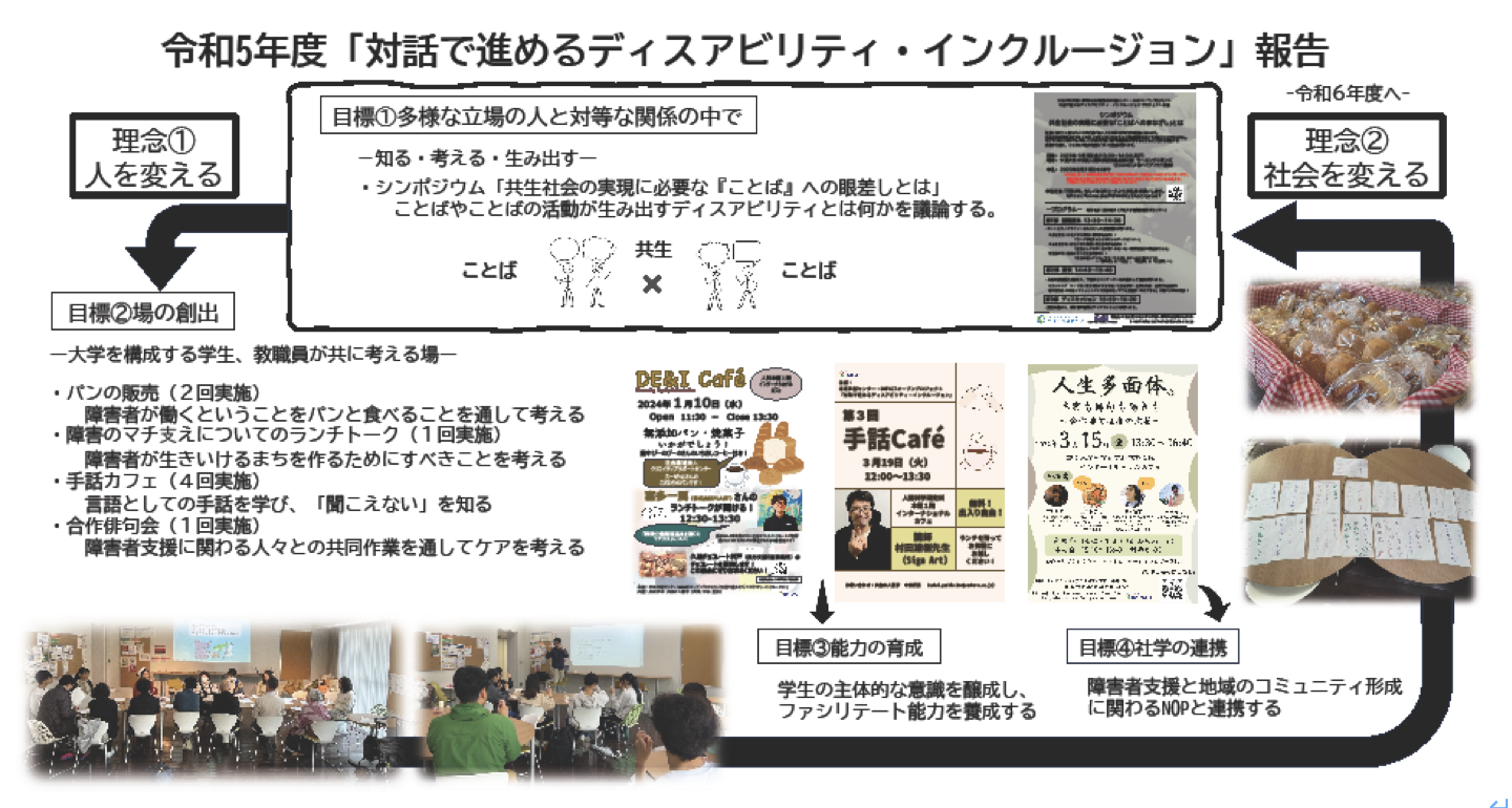 本プロジェクトの目的は、共生の基盤となる対話の機会を設けることにあった。今年度は、言語文化的特性や障害によって生じる多様性との接点を創出することを目指し、①ことばの能力に関するシンポジウム(1回)、②障害者の方々が作るパンを販売するDE&Iカフェ(2回)、③障害者支援に取り組む実践家とのランチトーク(1回)、④視覚言語である手話やそれによって育まれるろう文化に触れる手話カフェ(3回)を行った。また、⑤として、俳人であり障害者支援に従事する障害者と詩人として地域創生に関わる実業家とともに障害や芸術を通して人の生を考える合作俳句会(1回)を3月15日に行った。まず、シンポジウムでは教育や研究に携わる方々だけではなく、高校生を含めた学生さんの参加もあり、様々な立場から捉えたことばと対話の様相を共有することで、共生に求められる対話とは何かを議論することができた。