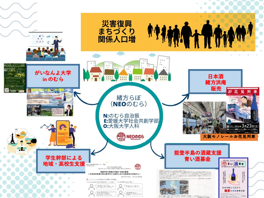 24年3月23日 大阪モノレール株式会社と共催でお花見列車を運行し、復興支援酒「緒方洪庵」を提供した。 西予市地域貢献研究事業に応募し、「被災地における若者の体験伝承意識に関する比較研究」という研究テーマで採択され、その研究成果は、研究成果報告書にまとめた。